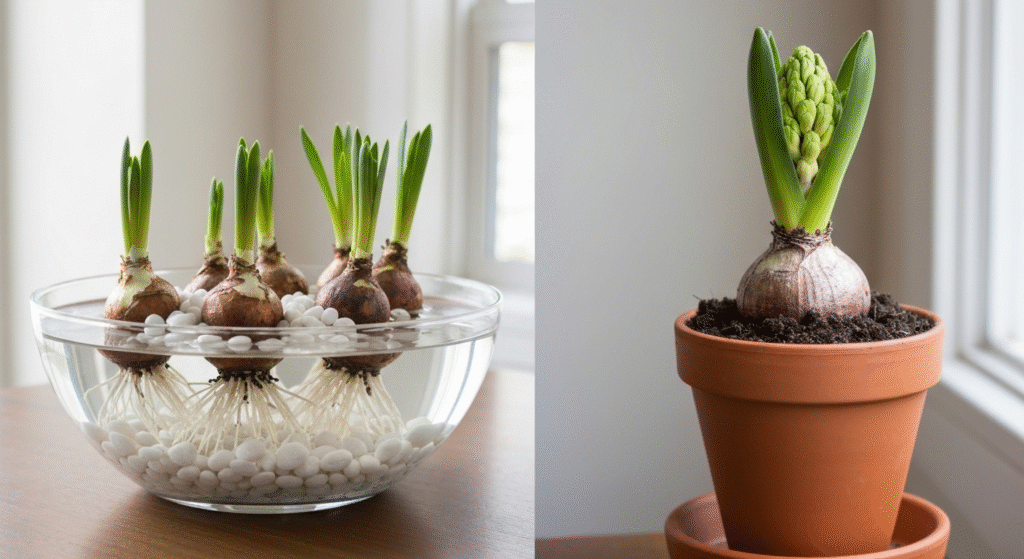 - For water forcing: Special hourglass-shaped forcing glasses are ideal for single hyacinth bulbs. For paperwhites, a shallow bowl or vase filled with pebbles or decorative stones is perfect.